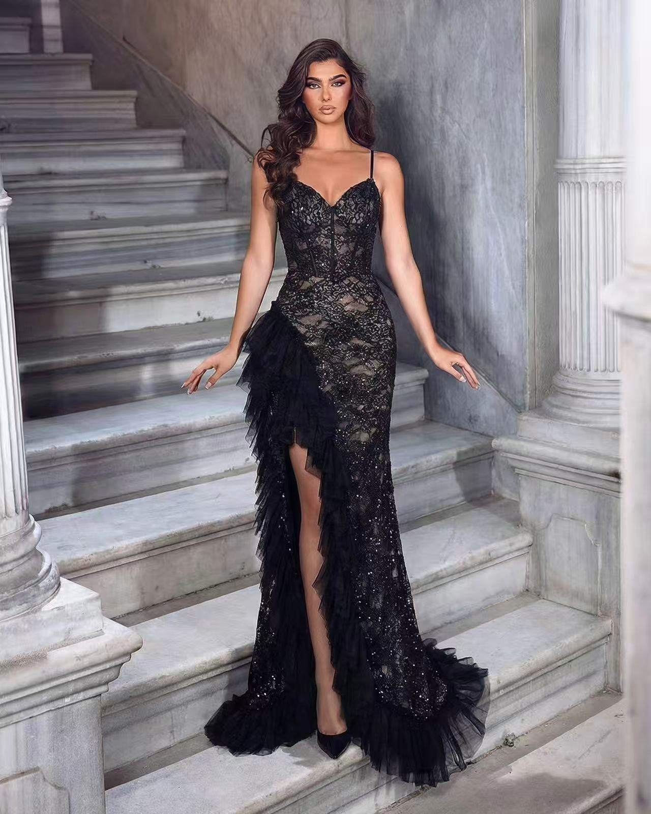 The long train evening gown is so ceremonial! When the skirt drags on the ground, you’ll feel like a princess—perfect for weddings.